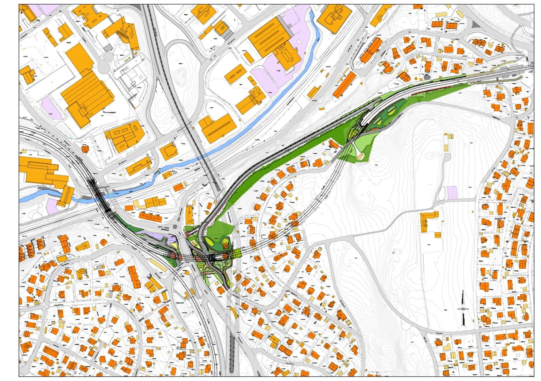 Kartet viser prosjektområdet for Østensjøbane-prosjektet, fra Brynseng i vest til Hellerud i øst.