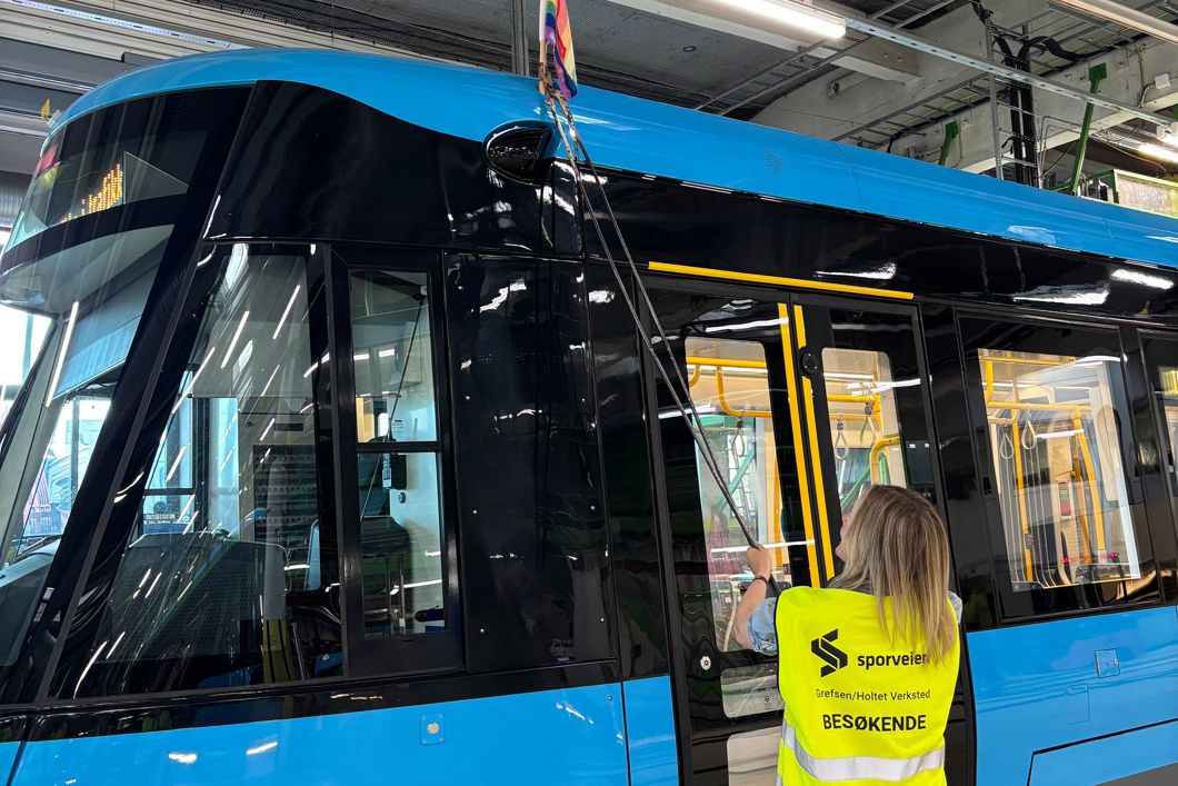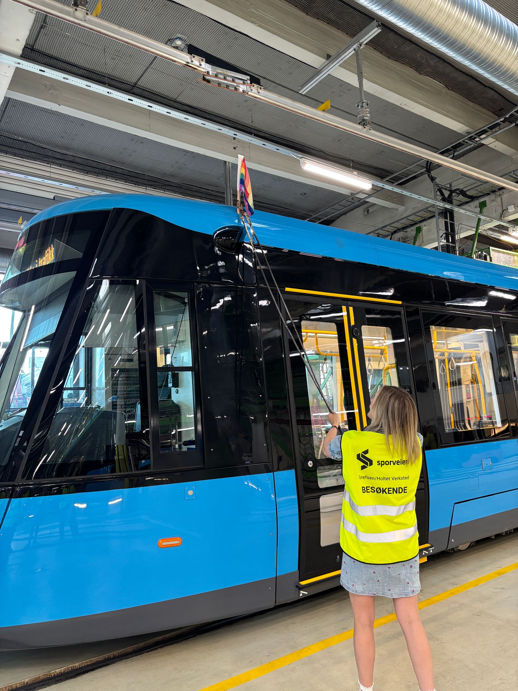 Og torsdag ble det første av mange hundre flagg satt på en av trikkene i Sporveien Trikken sine lokaler på Grefsen. Trikkene kjører med Pride-flagg 27. og 28. juni.