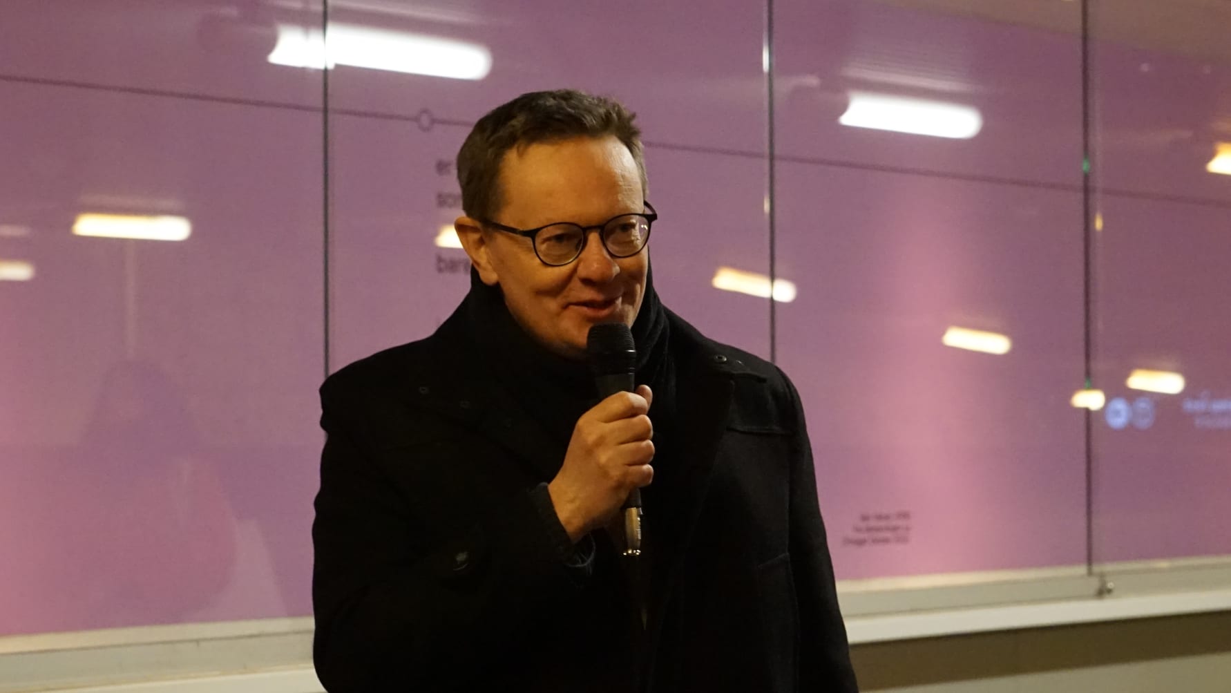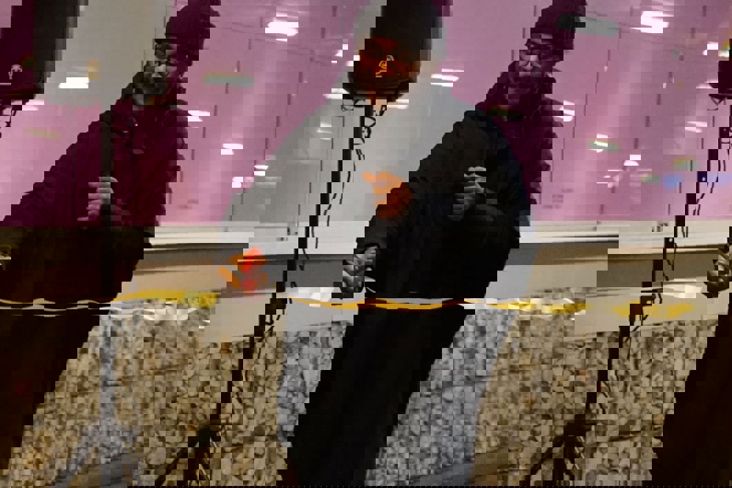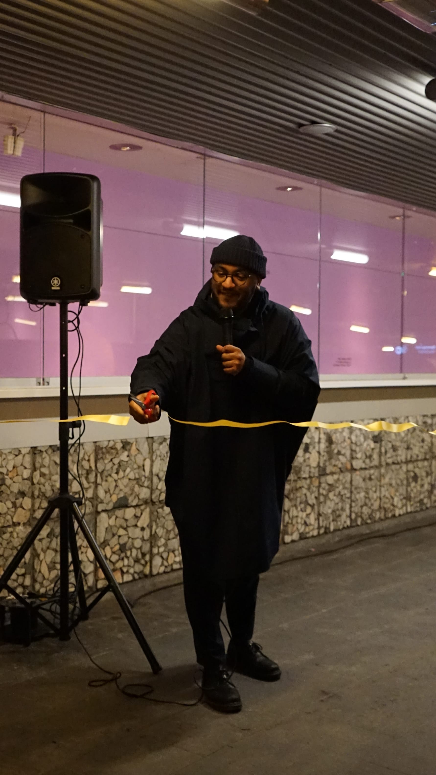 Byråd for kultur, idrett og frivillighet i Oslo kommune, Omar Samy Gamal, klipper bånd for å markere åpningen. Foto: Sporveien AS.