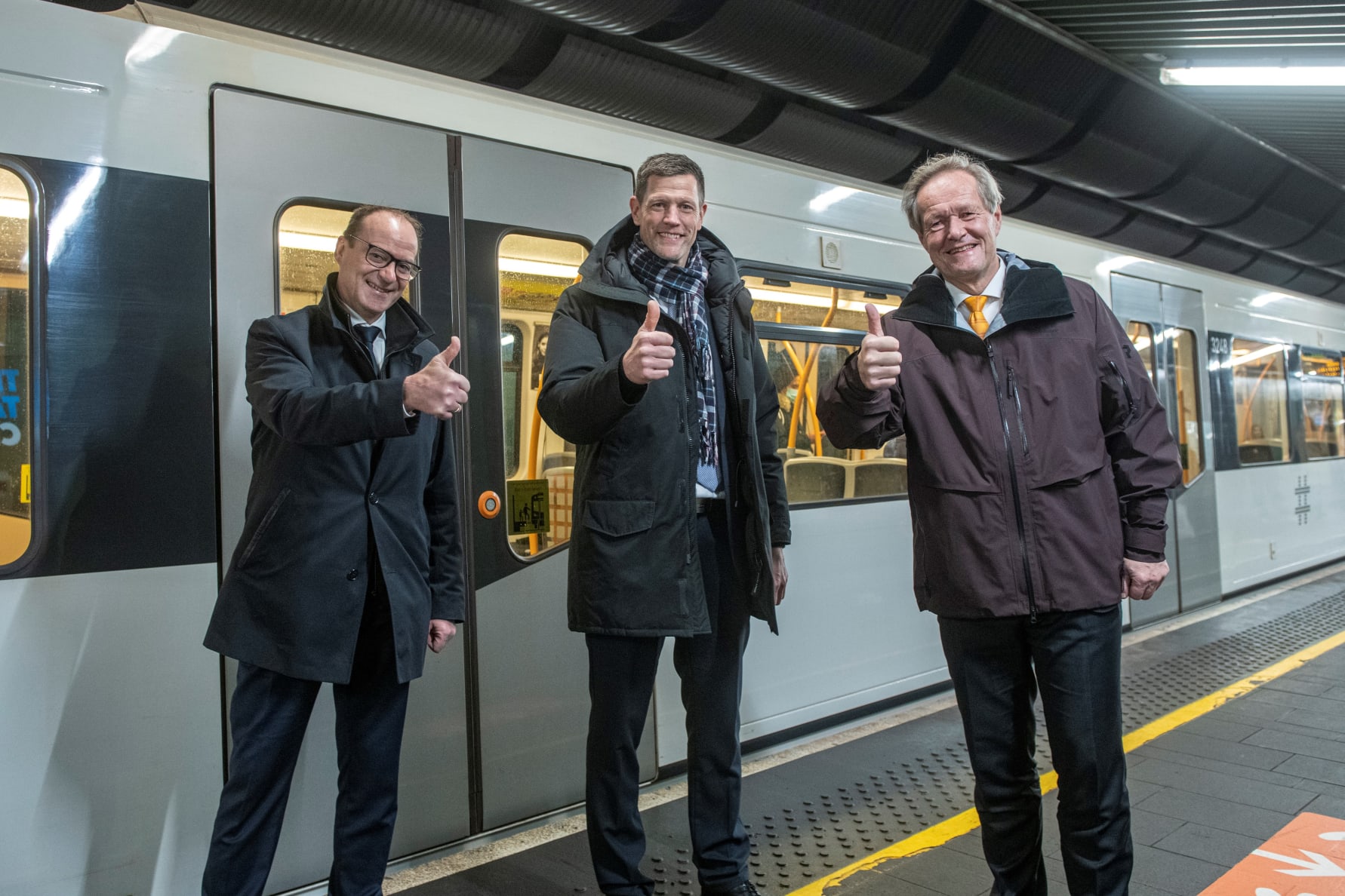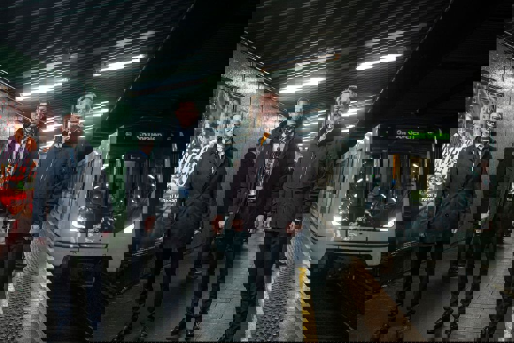 Foran f.v. Cato Hellesjø, sporveissjef, Lars Johan Andresen, CEO Siemens Mobility AS, Marc Ludwig, Head of RI MT i Siemens Mobility GmbH. Bak f.v. Per Magne Mathisen, konserndirektør for infrastruktur og eiendom i Sporveien og Sirin Stav, byråd iOslo.