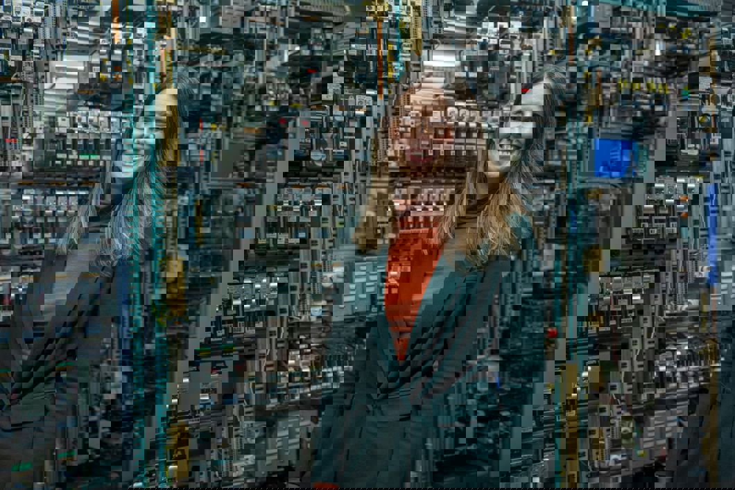 Byråd for miljø og samferdsel i Oslo kommune, Sirin Stav, foran dagens signalanlegg hos Sporveien. Releene fra 60-tallet skal nå byttes ut med ny, moderne teknologi.