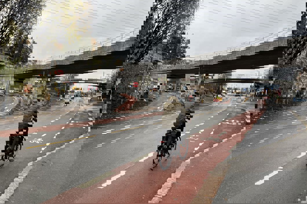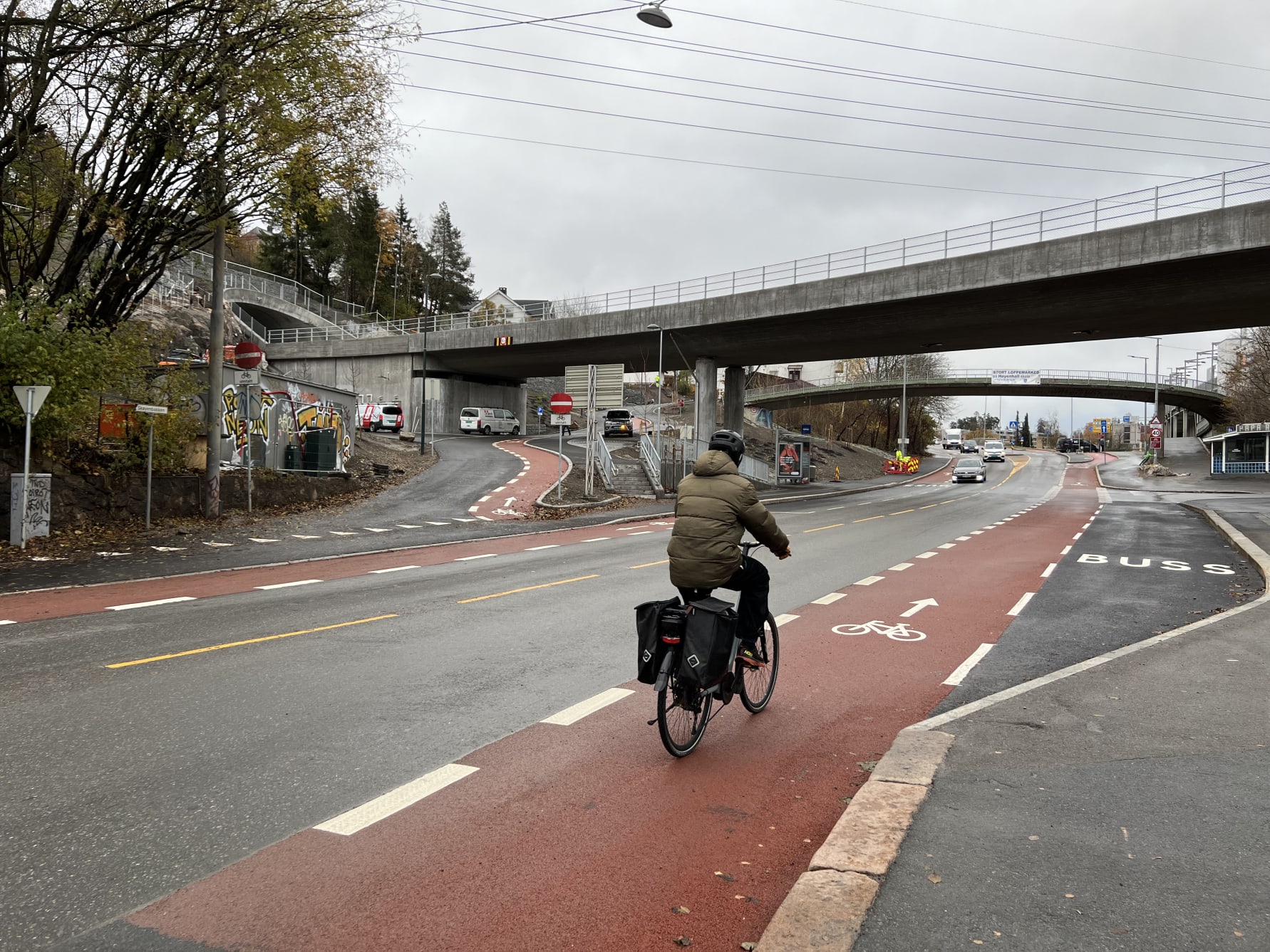 Flaskehals: Etter flere års anleggsarbeid er sykkelveien i Østensjøveien endelig slik den skal være - i utmerket stand med ny, rød asfalt. Foto: Sporveien.