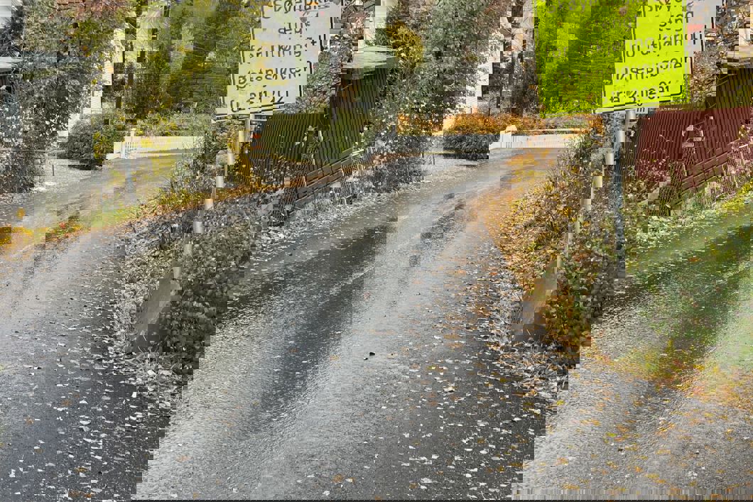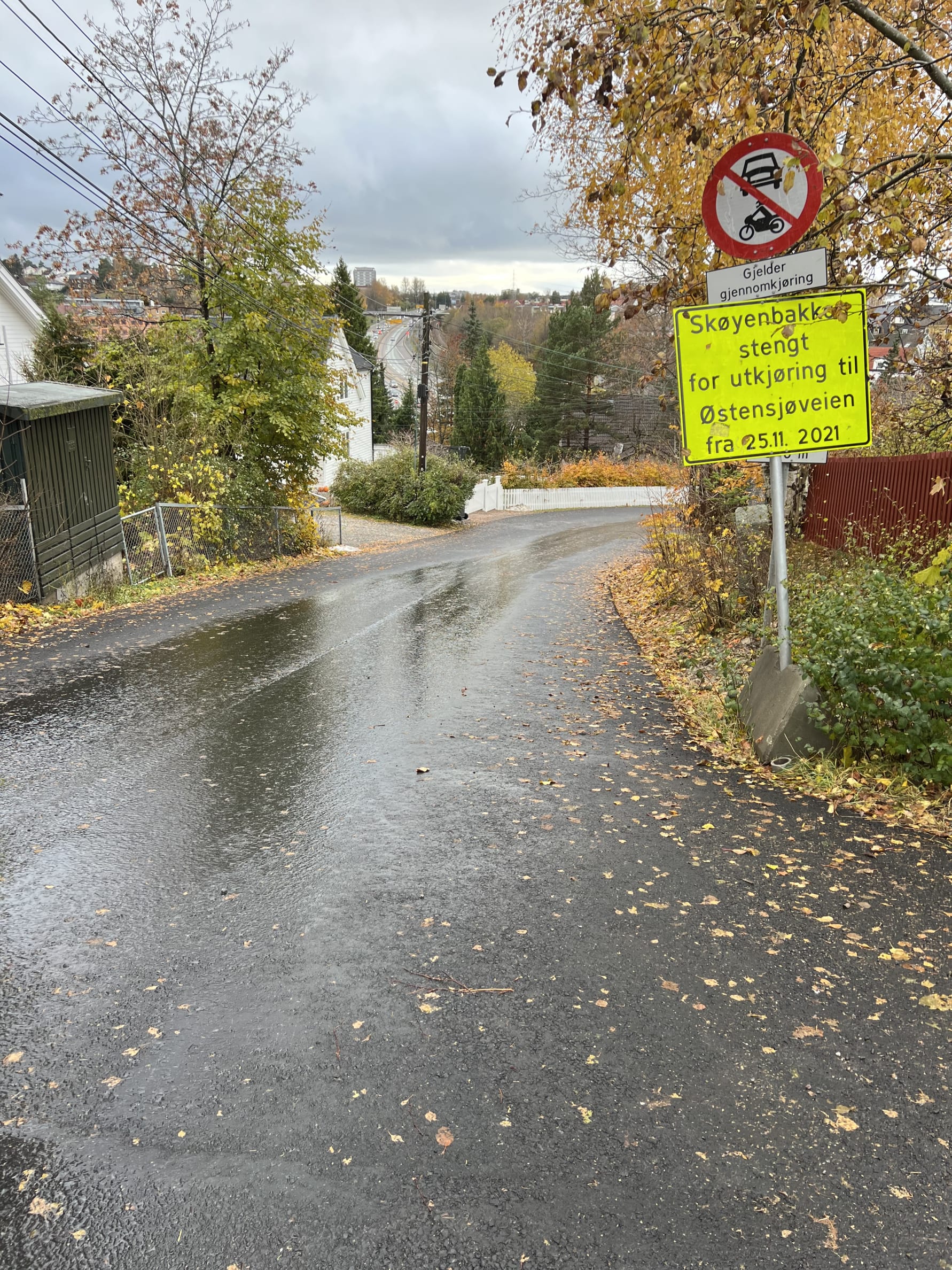 Ny asfalt: Etter mye anleggstrafikk har Skøyenbakken nå fått ny asfalt, og det to år gamle skiltet kan fjernes. Foto: Sporveien