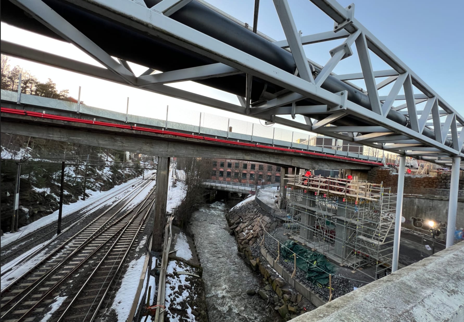 Over elva og jernbanen: Nye Bryn bru må heises inn over fjernvarmebrua nærmest Østensjøveien og inn på nybygde søyler og landkar. Arbeidene starter natt til mandag 6. februar, når Østensjøveien stenges. FOTO: Sporveien AS.