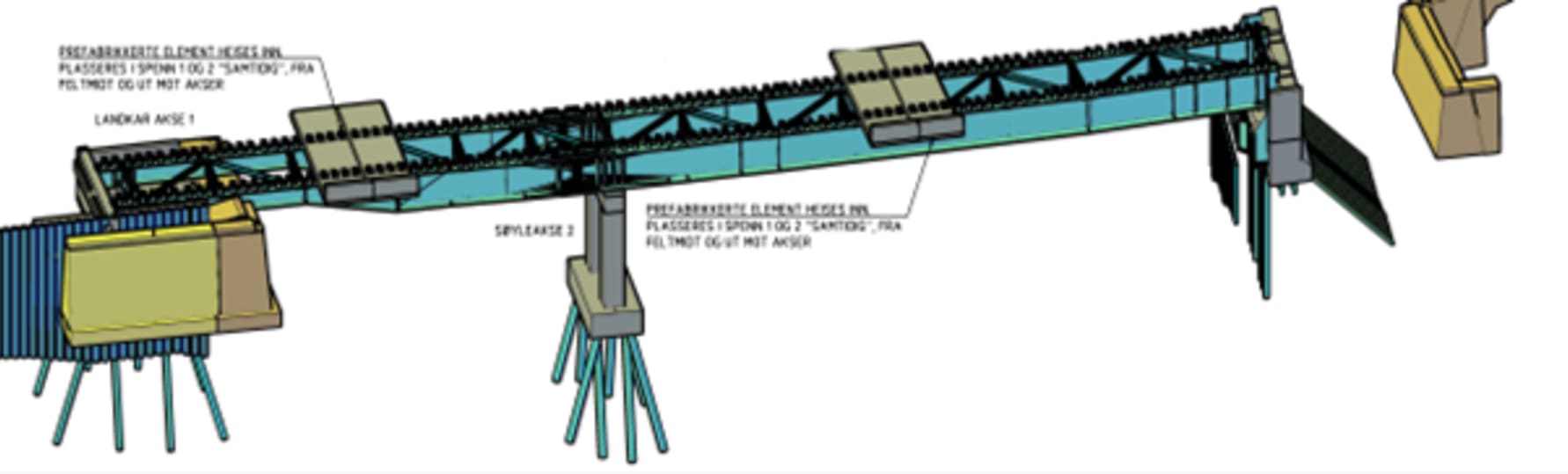 NØYAKTIG OPERASJON: Seksjon 1 av brua går fra søylene i midten ut til nybygd landkar til høyre. Seksjon 2 monteres på landkar til venstre og på søylene i midten. Til slutt legges 400 tonn med prefabrikerte betongelementer oppå stålet. Illustrasjon: Sporveien / Aas-Jakobsen Vianova nettverket