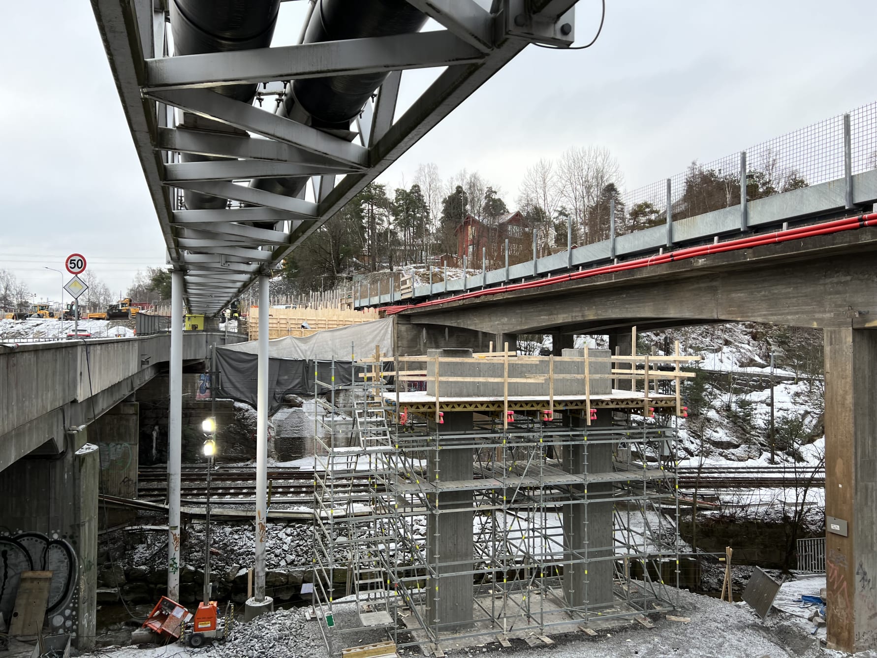 SKAL BÆRE TUNGT: De to søylene som skal bære nye Bryn bru over Alnaelva og Hovedbanen har reist seg de siste månedene.