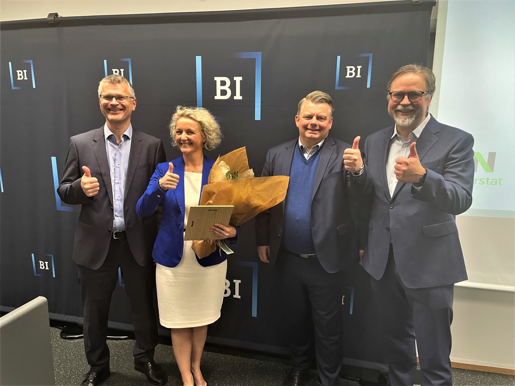 Fra venstre: Pål Silseth (Norsk Bærekraftbarometer) , Birte Sjule (Sporveien), Torgeir Kristiansen (Sporveien), Bengt Lorentzen (Norsk Bærekraftbarometer). Foto: Sporveien / Cato Asperud.