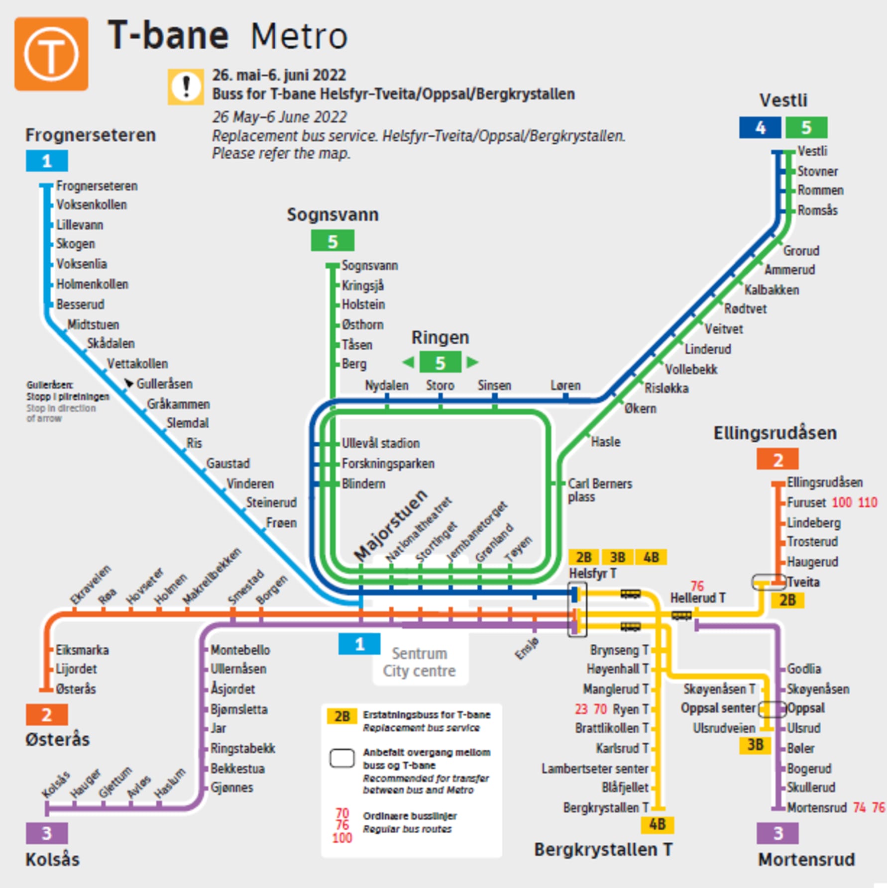 Reisende på T-banens linjer 1, 2, 3 og 4 henvises til Ruters reiseplanlegger eller Ruter.no for spesifikk reiseinformasjon i arbeidsperioden.