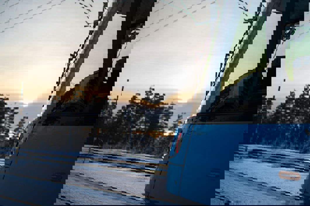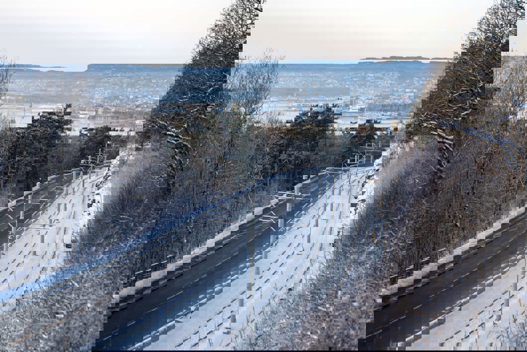 Foto av trikk på i vinterlandskap på Ekebergbanen. Foto: Sporveien.