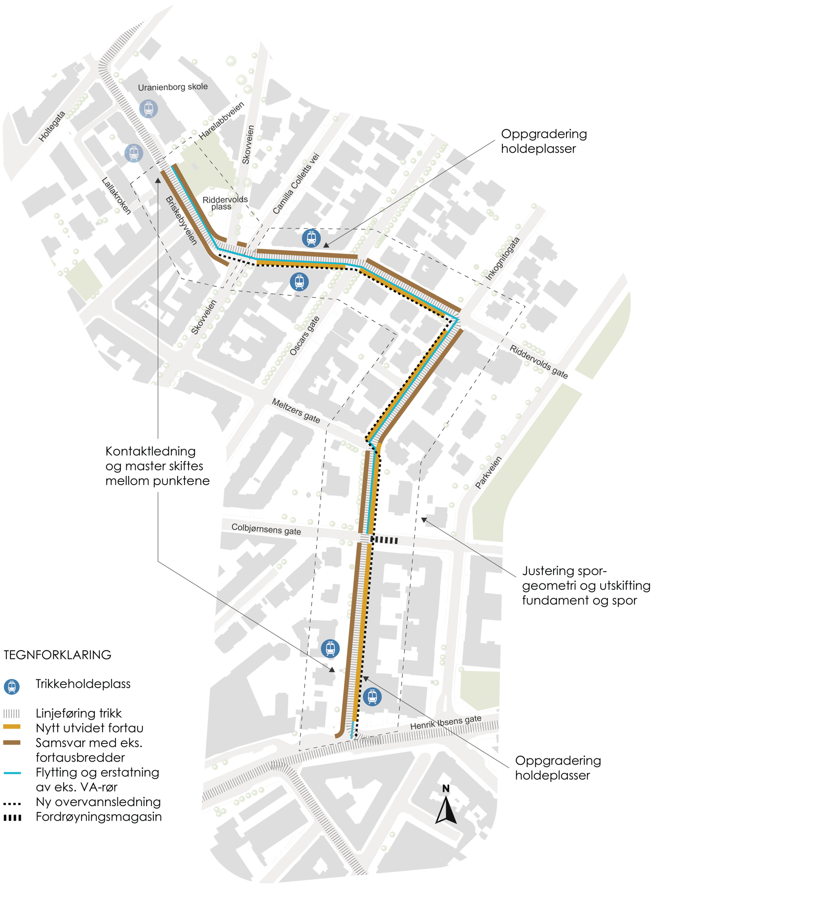 - Strekningen fra Henrik Ibsens gate til Riddervolds plass får en helt ny drakt med nye skinner, gater, fortau, vann- og avløpsledninger, og belysning.