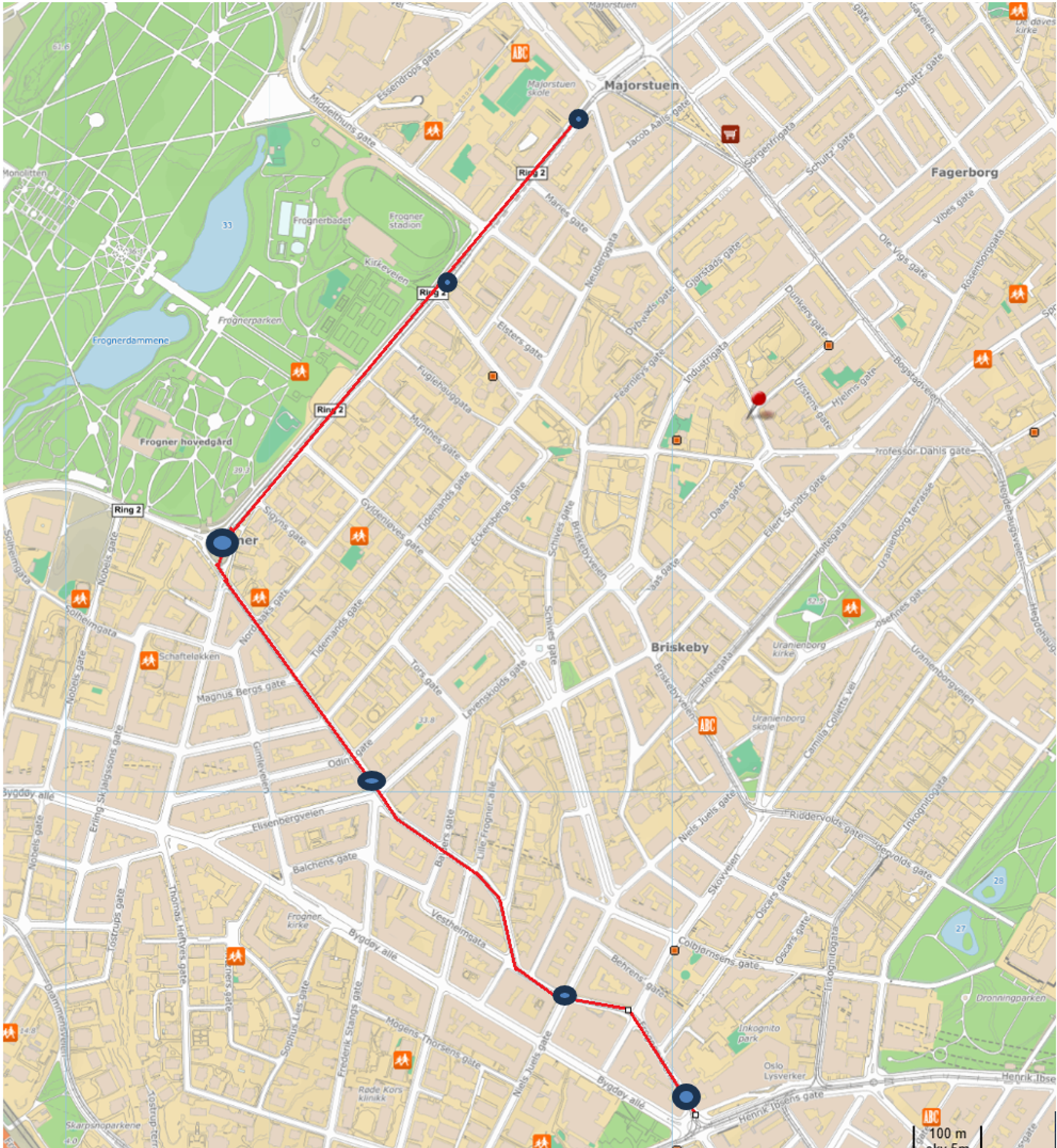 Punktene på kartet viser hvor det skal utføres nødvendig vedlikehold på strekningen mellom Majorstuen og Frogner plass, og videre i retning Solli.