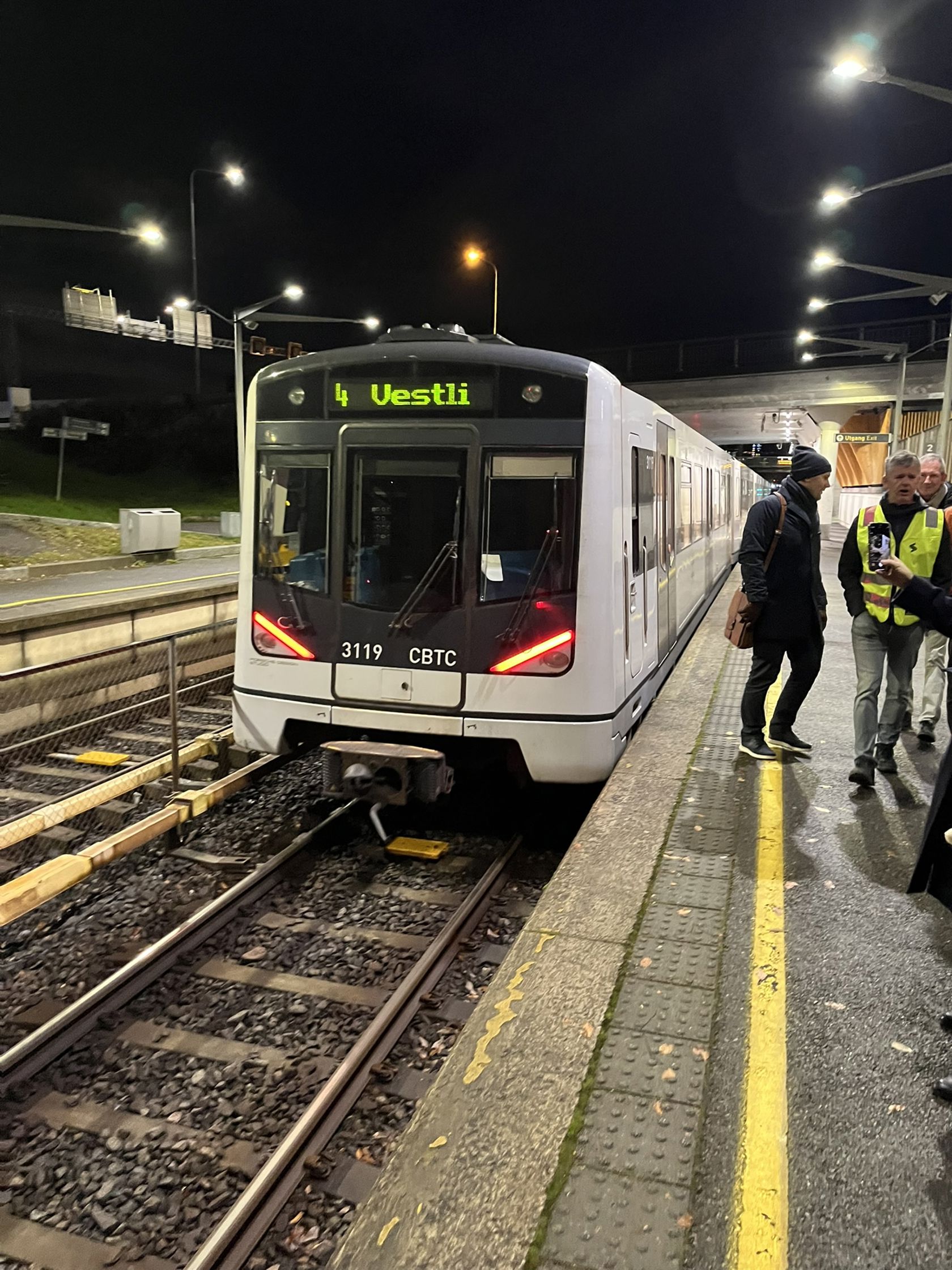 Første avgang: Første tog i prøvedrift med CBTC og passasjerer på Ryen 24. november 2025 etter første tur - fra Brattlikollen kjører man videre på det gamle signalsystemet. Foto: Sven Chr. Stenvaag