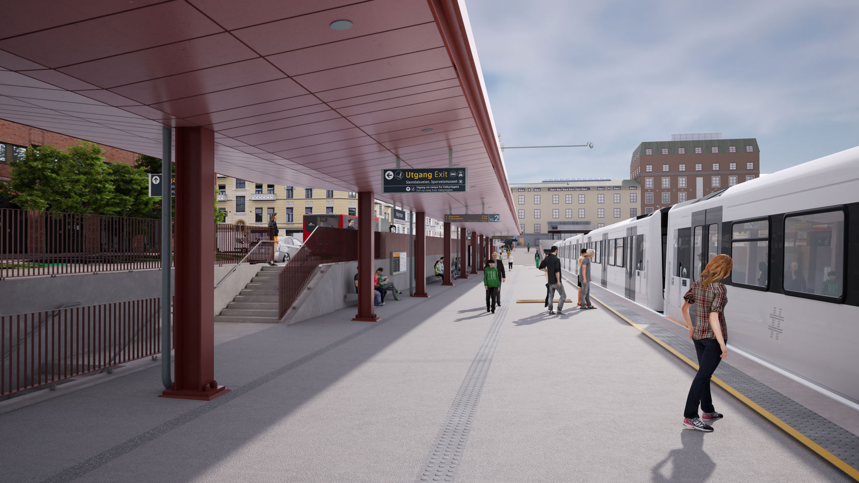 Bildet viser hvordan Majorstuen stasjon vil se ut i fremtiden, med en åpen plass opp mot ny gangbru over sporene til Politihøyskolen.